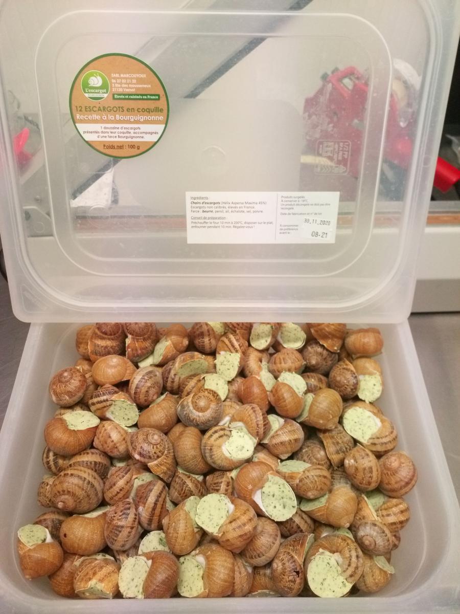 Une douzaine d'escargots présentés dans leur coquille, accompagnés d'une farce à la bourguignonne.