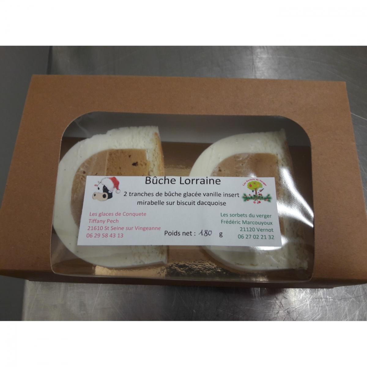 2 tranches de Bûche Pêche des îles - Sorbet pêche de vigne , glace vanille et biscuit dacquoise aux amandes.